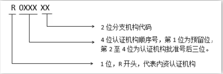 (一)内资认证机构:第1位为R,第2位至第5位为认证机构顺序号,第2位为预留扩展位,默认为0;第3位至第5位为认证机构批准号后三位。第6位至第7位为分支机构代码,由认证机构自行编码。